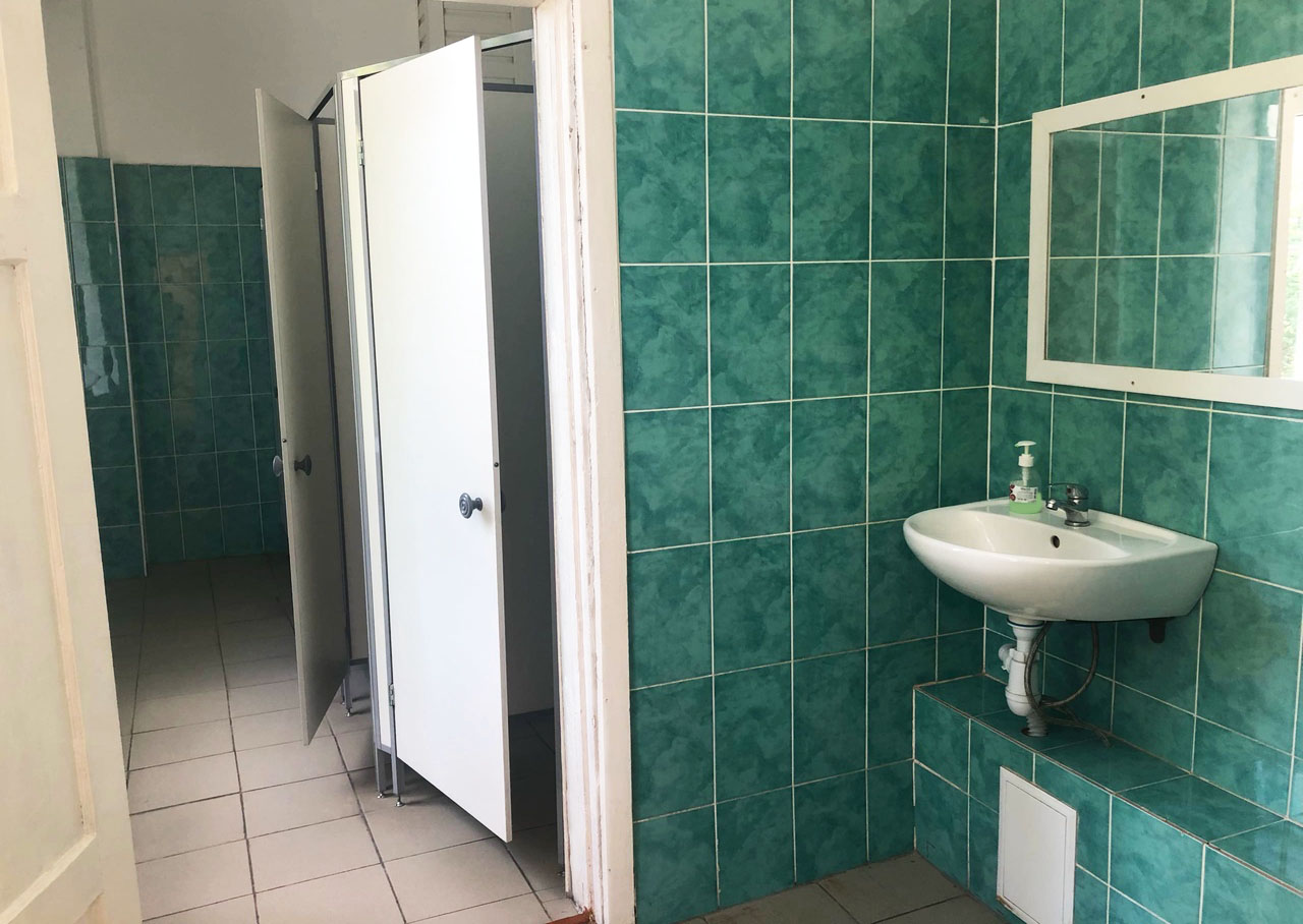На каждом этаже в правом и левом крыле здания размещаются туалеты для мальчиков и девочек, оборудованы кабинами с дверями. Количество санитарных приборов определяется из расчета: 1 унитаз на 3 девочки, 1 умывальник на 7 девочек; 1 унитаз на 8 мальчиков, 1 умывальник на 18 мальчиков. Площадь санитарных узлов для мальчиков и девочек следует принимать из расчета не менее 0,1 м2 на одного обучающегося. В санитарных узлах рядом с умывальными раковинами размещено мыло, бумажные полотенца, дозаторы с дезинфицирующими средствами для обработки рук, педальные ведра для сбора мусора; унитазы оборудованы сидениями, изготовленными из материалов, допускающих их обработку моющими и дезинфекционными средствами. На первом этаже школы находится туалет для инвалидов. Он оборудован поручнями, держателями и тактильными указателями,а также оснащен специальной кнопкой вызова помощи персонала, в случаях возникновения экстренной ситуации.