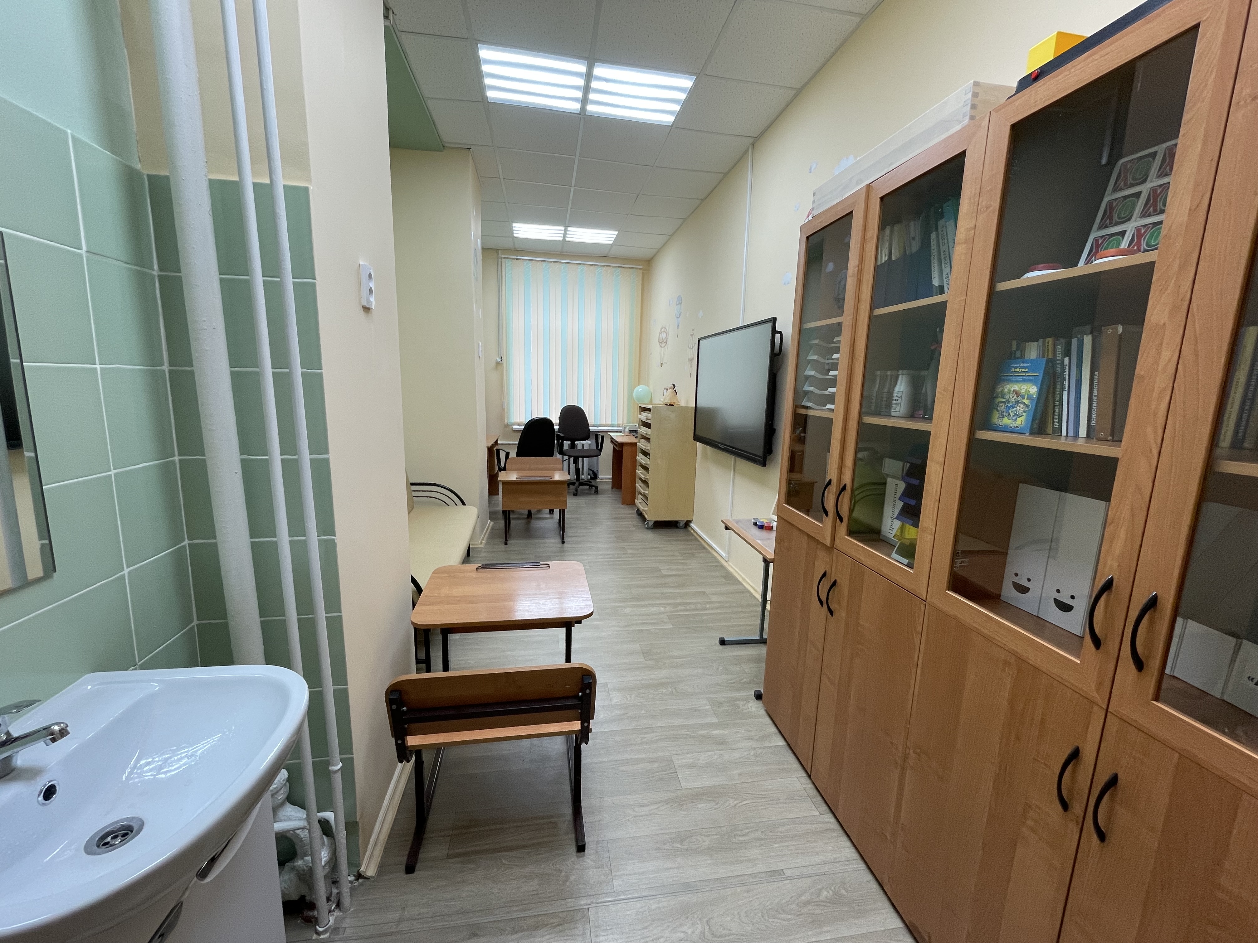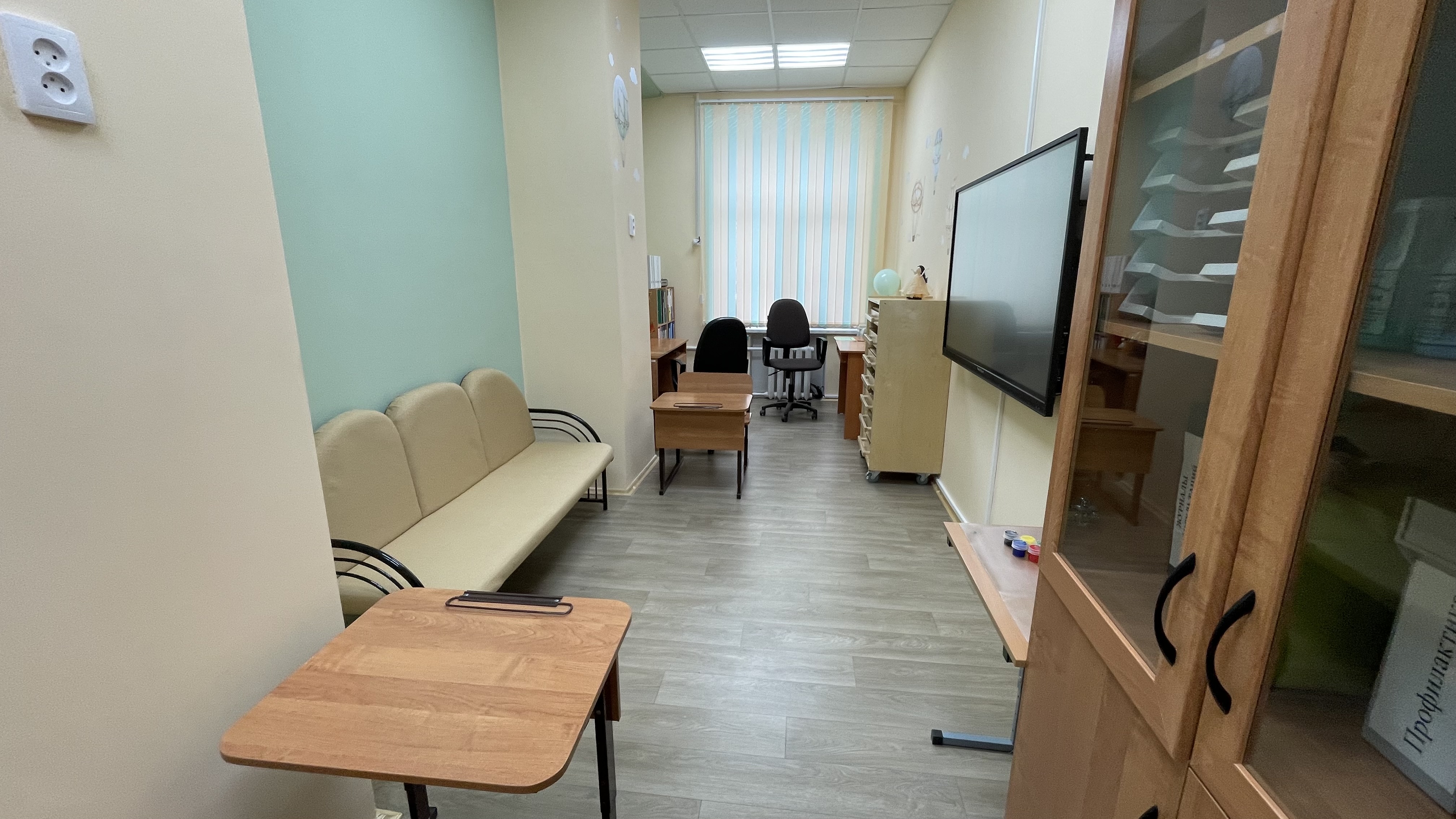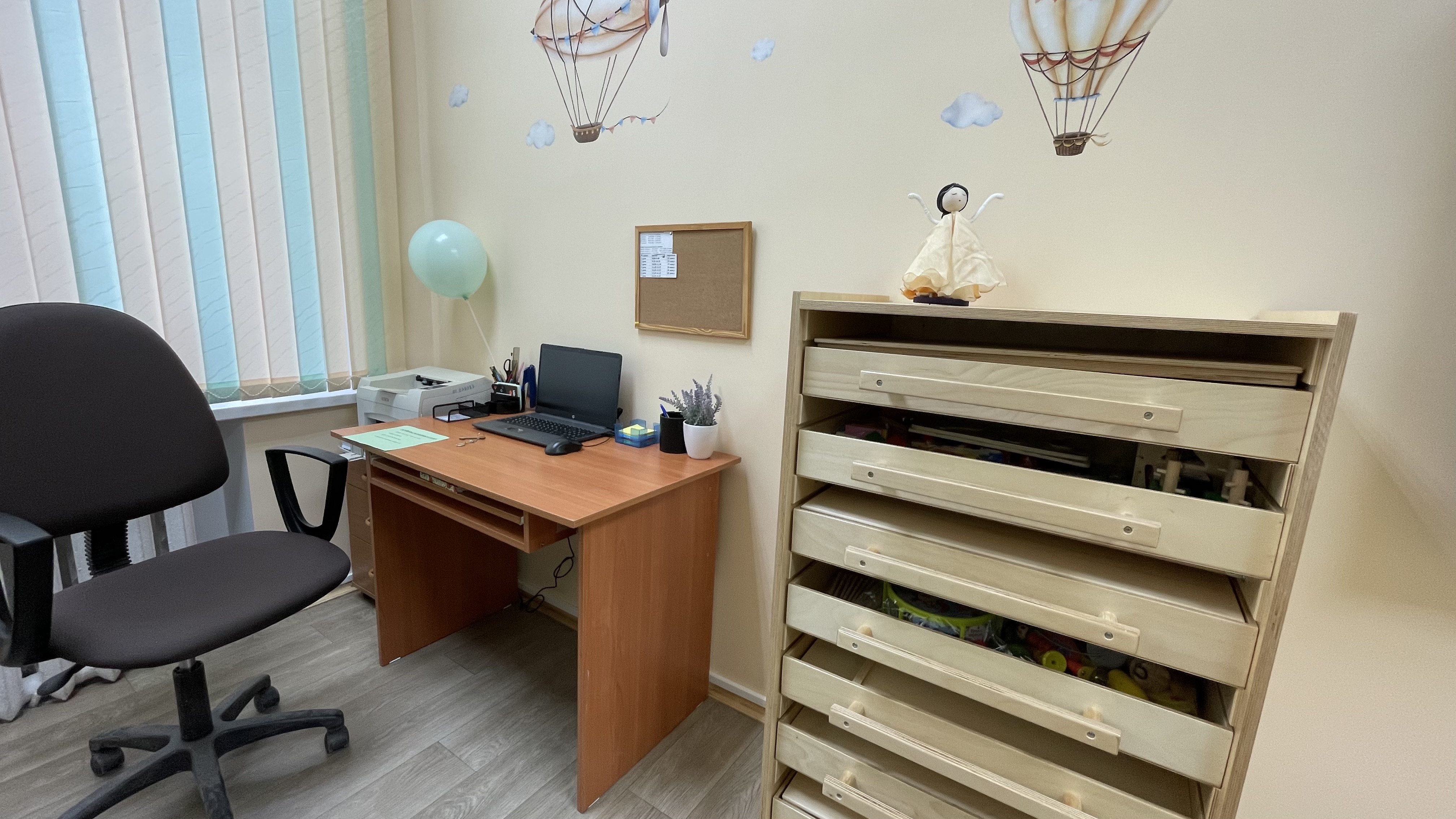 Кабинет психолога оборудован интерактивной панелью, арт-комплексом с прозрачным мольбертом, песочным столом с подсветкой (использование песочной терапии на коррекционных занятиях), нейротренажером (игровое оборудование, улучшающее работу мозга через воздействие на тело).
