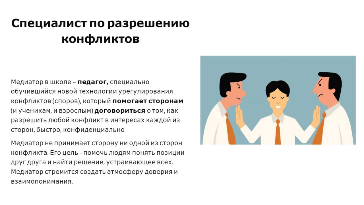 - Нейтральность (медиатор не решает, кто прав, а кто виноват.